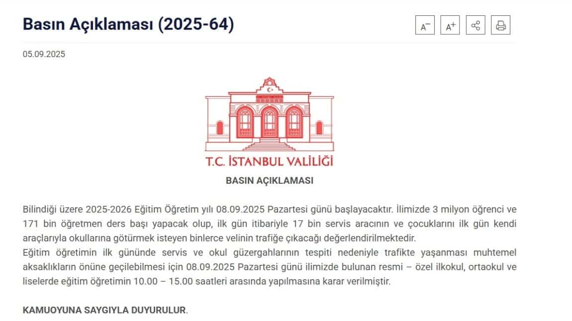 2025-2026 Eğitim Öğretim Yılı ilk ders günü olan 8 Eylül 2025 Pazartesi günü okulumuzda eğitim öğretim İstanbul Valiliğince belirtilen saatlerde yapılacaktır.
