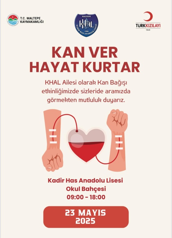 Kadir Has Anadolu Lisesi olarak 23 Mayıs tarihlerinde okulumuz bahçesinde yapılacak Kan Bağışı etkinliğinde hem öğrencilerimizin farkındalığını arrtırmayı hem de ihtiyaç duyan insanlara yardım etmeyi amaçlamaktayız.